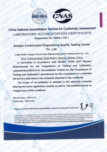 國家城市軌道交通建設工程產品質量監督檢驗中心, 依托江蘇省建筑科學研究院和江蘇省建筑工程質量檢測中心在城市軌道交通建設工程領域的綜合技術優勢,于2016年10月獲得國家認證認可監督委員會批準授權..